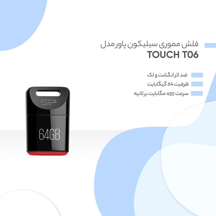 شرکت «سیلیکون پاور» محصولی را روانه بازار کرده که درواقع یک فلشمموری با ابعاد بسیار کوچک است. این فلشمموری از طریق درگاه USB2.0 به کامپیوتر متصل میشود و میتواند اطلاعات را با سرعت زیاد انتقال دهد. ابعاد کوچک این فلشمموری باعث شده که به راحتی بتوان آن را در جیب لباس قرار داده و همیشه با خود همراه داشته باشیم. شرکت سیلیکون پاور یک درپوش محافظ برای فلشمموری Touch T06 تعبیه کرده تا بتوان از درگاه USB آن در برابر نفوذ غبار محافظت کرد. در قسمت بالایی این فلشمموری یک شیار آویز به چشم میخورد که امکان اتصال فلشمموری به جاسوییچی را میدهد. فلشمموری Touch T06 در برابر نفوذ مایعات، لرزش و غبار مقاوم است.