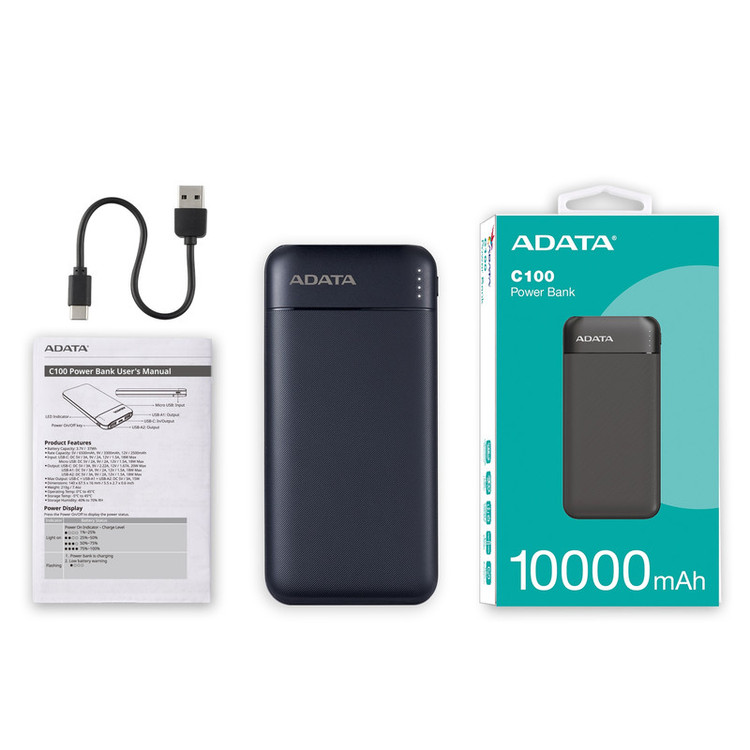 شارژر همراه «ای دیتا» مدل «C100» محصولی نازک، سبک و خوشدست است که با روکش مقاوم روانه بازار شده است. این پاوربانک دارای دو درگاه خروجی USB است و یک ورودی TIPE - C و بدنه مقاوم در برابر حریق دارد. با این مدل پاوربانک می توانید گوشی موبایل را سریعتر شارژ کنید و خود پاوربانک را هم سریعتر شارژ کنید. باتری پاوربانک C100 ظرفیتی معادل 10000 میلیآمپرساعت دارد و از نوع لیتیوم-پلیمر است. در صورت پر بودن این باتری چهار عدد نشانگر روی بدنه پاوربانک روشن خواهند بود. این پاوربانک دارای الگوی پوششی برای مقاومت در برابر سر خوردن و گریپ بهتر است. همچنین مقاوم در برابر اثرانگشت و لکه است. این پاوربانک قابلیت شارژ سه دستگاه به طور همزمان را دارد و از شارژ سریع PD/QC 20 واتی پشتیبانی می کند