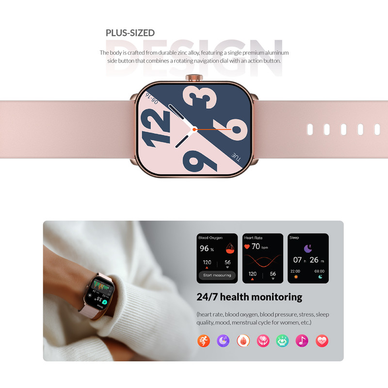 توضیحات جنس بدنه : شیشه مقاوم 2.5D با سختی بالا / فریم مقاوم از جنس پلیکربنات (PC Frame) / دکمه ساختهشده از استیل ضدزنگ 304L برای دوام بیشتر / دکمه چرخان (Rotating Crown Button) برای کنترل آسانتر عملکردها