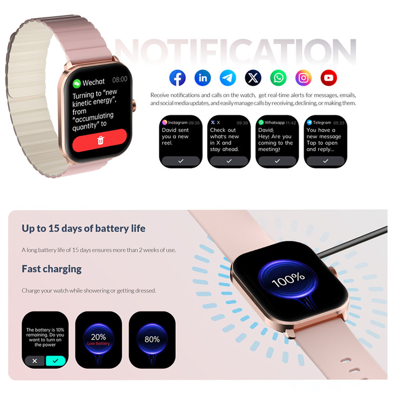 قابلیتهای ساعت هوشمند : قابلیت مکالمه از طریق بلوتوث , کنترل موسیقی (Music Player) , پشتیبانی از زبان فارسی در منو و سیستمعامل , قابلیت تغییر طرح ساعت یا تم , صفحه همیشه روشن (Always-on Display)